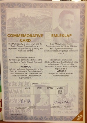 A 150 éve született író tiszteletére a klub rádióállomásával az alkalomra létrehozott speciális hívójel (HA150GG) segítségével lehet összeköttetést létesíteni. A rádiókapcsolat létrejöttét a klub az egri önkormányzattal közösen készített emléklappal igazolja és köszöni meg.