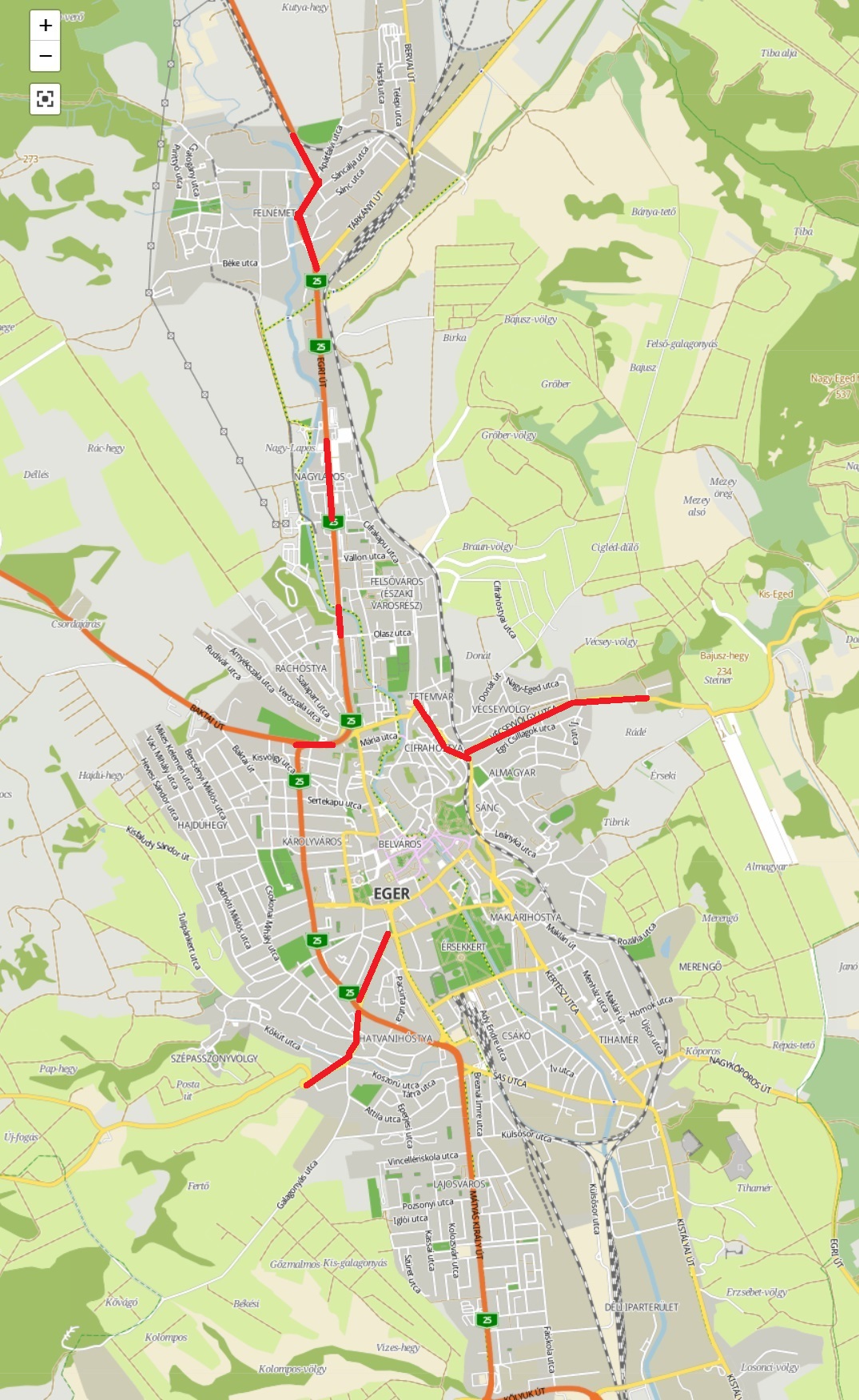 • Felnémet, Felsőtárkány csomópont és Eger település vége tábla (Felnémet vasúti átjáró) közötti